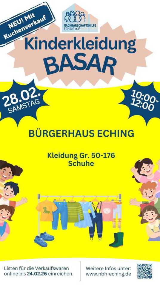 Am 28. Februar ist es wieder soweit. Im Bürgerhaus Eching (Roßbergerstraße 6) könnt ihr von 10 bis 12 Uhr Kinderkleidung einkaufen.