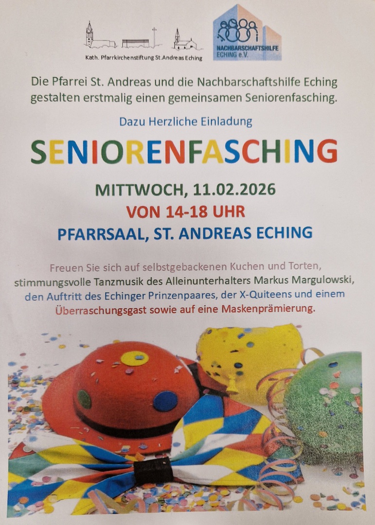 Die Nachbarschaftshilfe Eching und die Pfarrei St. Andreas gestalten erstmalig einen gemeinsamen Seniorenfasching für „alle Junggebliebenen“: