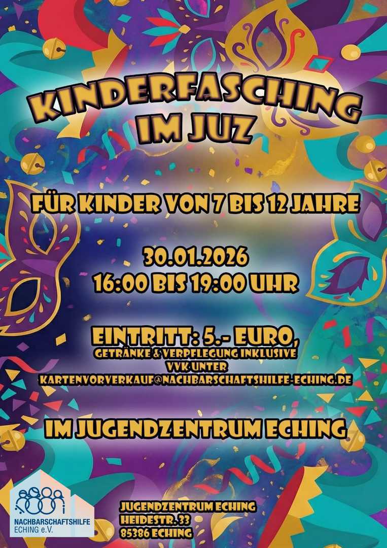 Die Nachbarschaftshilfe Eching und das Jugendzentrum Eching veranstalten wieder einen gemeinsamen Kinderfasching für alle zwischen 7 und 12 Jahren: